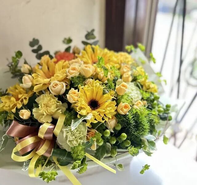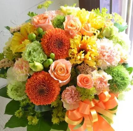 「黄色オレンジ系で明るい感じ」は暖色系のお花を使用し明るく爽やかに仕上げます。
