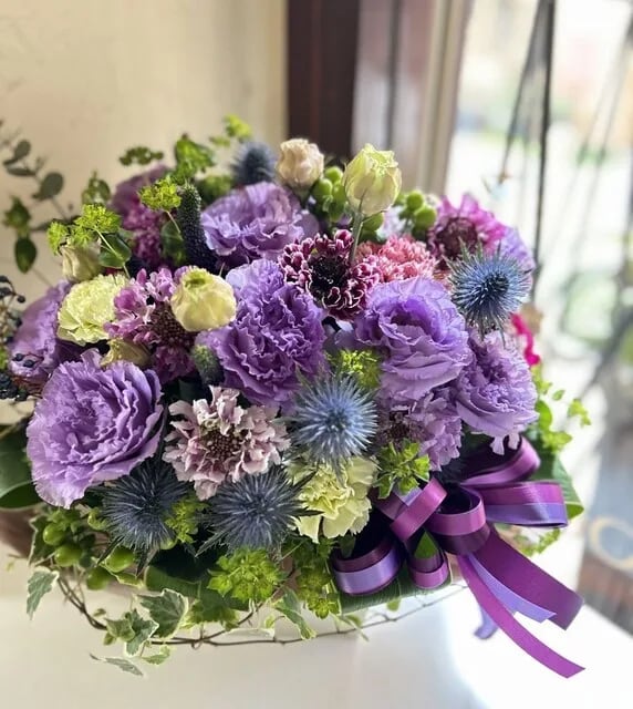 「シックで大人っぽい感じ」は紫系のお花を使用し、渋色系で大人華やかに仕上げます。